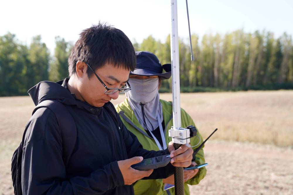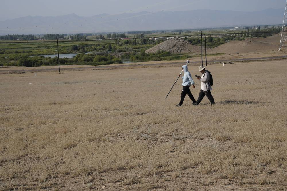 尼勒克县第四次全国文物普查工作队队员魏中畅(左一)手持RTK测量仪,复核文物信息。新华社记者 白志强 摄