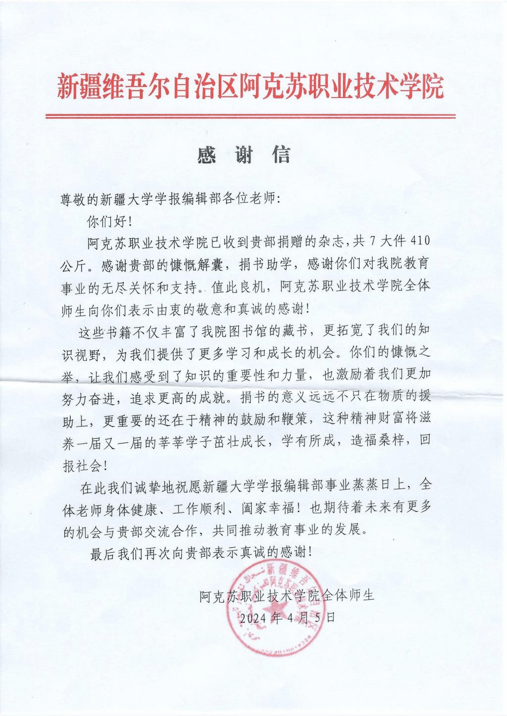 近日,九九精品视频一区在线久久久久久久久久毛片精品美女|国产99久久久久久免费看|中文精品99久久国产|国产69精品久久久久9999|精品久久久久久中文字幕无码|亚洲熟妇无码久久精品国产精品99|精品国产天堂综合一区在线学报编辑部收到新疆维吾尔自治区阿克苏职业技术学院的感谢信和捐赠证书,感谢九九精品视频一区在线久久久久久久久久毛片精品美女|国产99久久久久久免费看|中文精品99久久国产|国产69精品久久久久9999|精品久久久久久中文字幕无码|亚洲熟妇无码久久精品国产精品99|精品国产天堂综合一区在线学报编辑部捐赠的学术期刊。这些期刊不仅充盈了对方学校图书馆的存书量,提升了教育、教学资源的配置,还丰富了学生们的精神文化生活,有利推进书香校园建设的发展。
